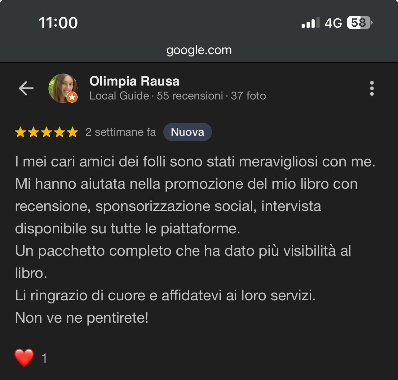 "Ringrazio I Folli Scrivono per la promozione del mio libro e l’ottima accoglienza durante l’intervista. La recensione della mia raccolta poetica è stata precisa, profonda e attenta alle tematiche. Mi sono sentito sempre a mio agio, con domande giuste e pertinenti. Consiglio il loro supporto a chi vuole dare visibilità al proprio libro."